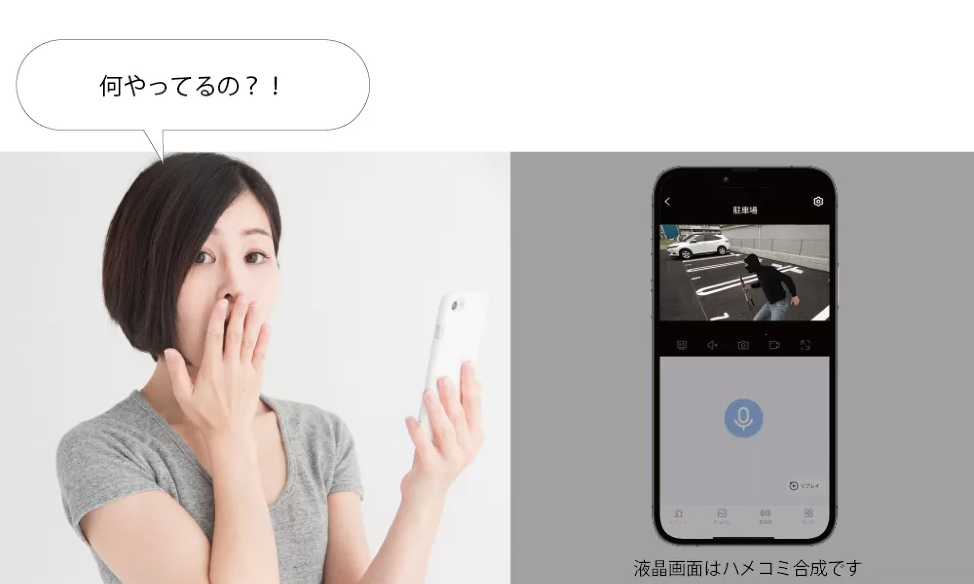 ※ 動体を検知すると、カメラからサイレンが鳴り、スマートフォンに通知します。 マイクボタンで、カメラ側とやりとりできます。